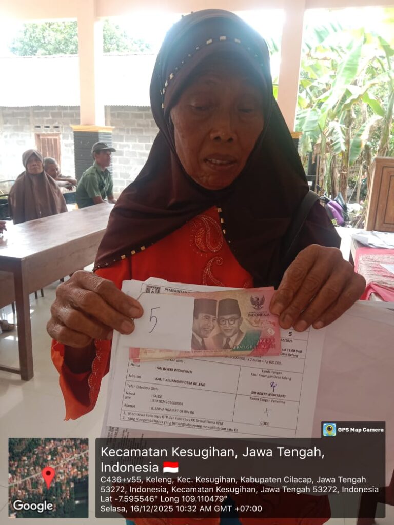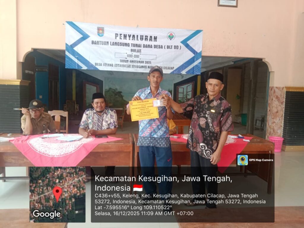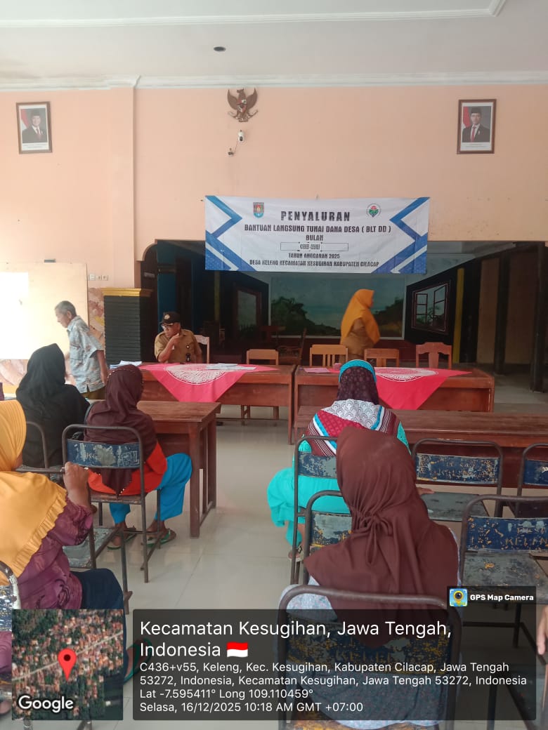Pemerintah Desa Keleng, Kecamatan Kesugihan, Kabupaten Cilacap melaksanakan kegiatan Penerimaan Bantuan Langsung Tunai Dana Desa (BLT-DD) Bulan November–Desember pada Selasa, 16 Desember 2025. Kegiatan ini dilaksanakan mulai pukul 10.00 WIB hingga selesai, bertempat di Balai Desa Keleng.